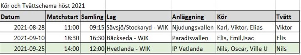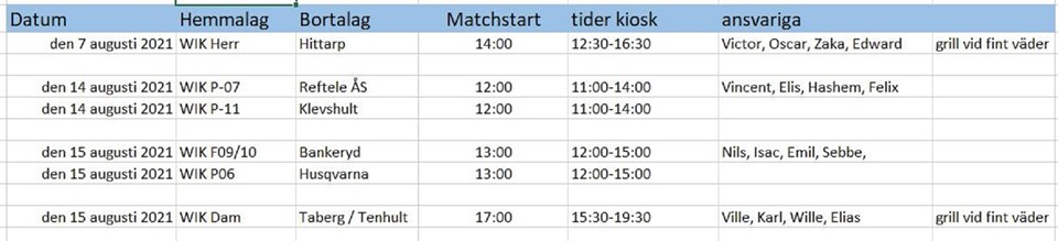 Vi har kiosken på IP, lista och datum ses nedan. Våran första match är mot Husqvarna hemma den 15 augusti, träningarna startar vi dock den 2 augusti. Datum Hemmalag Bortalag Matchstart tider kiosk ansvariga den 7 augusti 2021 WIK Herr Hittarp 14:00 12:30-16:30 Victor, Oscar, Zaka, Edward den 14 augusti 2021 WIK P-07 - Reftele ÅS 12:00 11:00-14:00 Vincent, Elis, Hashem, Felix den 14 augusti 2021 WIK P-11 - Klevshult 12:00 11:00-14:00 -"- den 15 augusti 2021 WIK F09/10- Bankeryd 13:00 12:00-15:00 Nils, Isac, Emil, Sebbe, den 15 augusti 2021 WIK P06 Husqvarna 13:00 12:00-15:00 -"- den 15 augusti 2021 WIK Dam Taberg 17:00 15:30-19:30 Ville, Karl, Wille, Elias