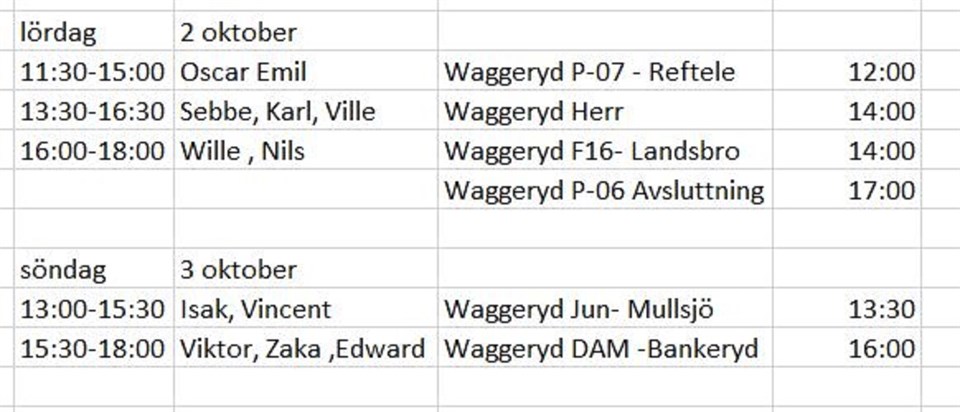 Hej Nästa helg 2-3 oktober har vi kiosken. Har satt ihop ett litet schema. Vi går om lott och hjälper varandra. Waggeryd P-06 spelar en träningsmatch på lördagen borta mot Skillingaryd med matchstart 15:00. Direkt efter matchen åker vi till IP för Bastu, korv och prisutdelning.Detta borde vara slut vid ca 18:30. lördag 2 oktober lag matchstart 11:30-15:00 Oscar Emil Waggeryd P-07 - Reftele 12:00 13:30-16:30 Sebbe, Karl, Ville Waggeryd Herr 14:00 16:00-18:00 Wille , Nils Waggeryd F16- Landsbro 14:00 Waggeryd P-06 Avsluttning 17:00 söndag 3 oktober 13:00-15:30 Isak, Vincent Waggeryd Jun- Mullsjö 13:30 15:30-18:00 Viktor, Zaka ,Edward Waggeryd DAM -Bankeryd 16:00