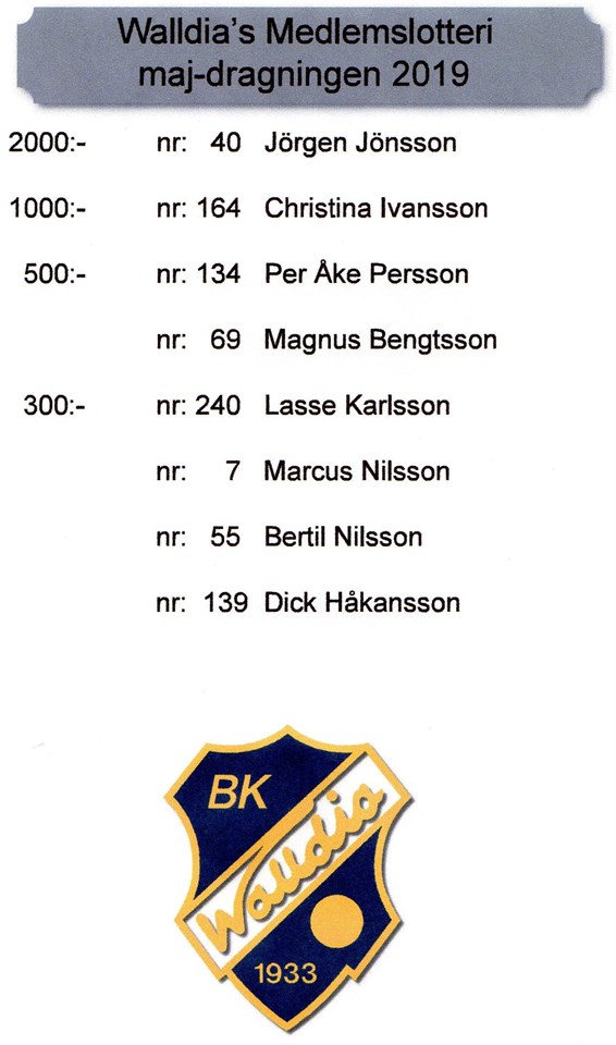 Det har förrättats dragning i medlemslotteriet och utfallet blev enligt nedan. Grattis alla pristagare och tack för att ni stöder vår förening. BK Walldia 16 jun 2019 0kommentarer