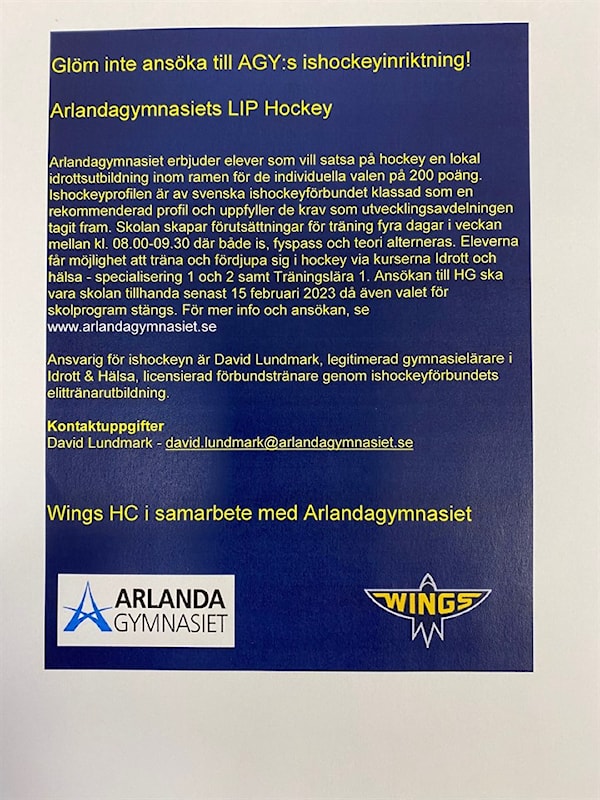 Wings hockey informerar om Arlanda Gymnasium samt val till hockeyinriktning.