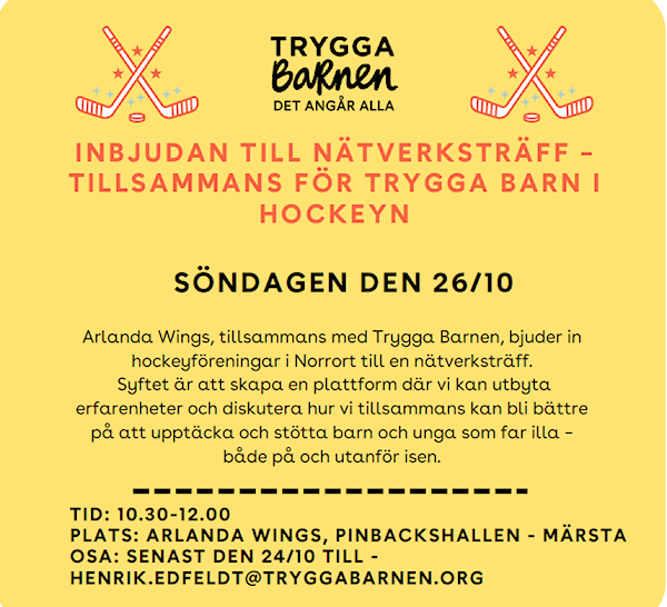Tag chansen att vara del i vår nätverksträff ned Trygga Barnen och Hockeyklubbarna Täby, Viggbyholm, Vallentuna, Sollentuna och Wings.