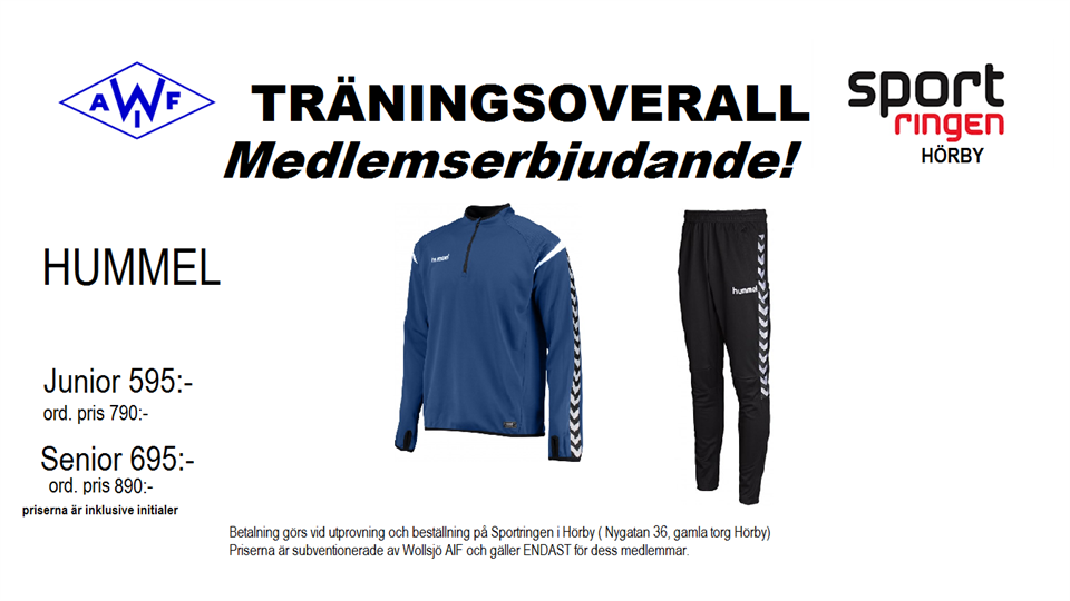 Det är dags att beställa profilkläder för de som så önskar. Klubben har tagit fram ett par paket med kläder som aktiva medlemmar kan köpa till subventionerade priser. Tillbehör: Träningsväska (inkl. initialet), mössa eller pannband. Paket 1: Träningsoverall (Byxa + Tröja) inkl. namn Paket 2: Träningspaket (Shorts, t-shirt, strumpor samt windbreaker-tröja) Är ni intresserade av att titta på produkterna på så finns de sparade under "dokument" här på sidan. Klicka på "mer" uppe i högra hörnet och därefter på "dokument". Från och med måndag 19/3 går det att åka till Sportkalle i Hörby för att prova ut kläder och beställa. Första omgången kläder kommer att skickas för beställning den 29/3. Det går att beställa även efter den 29 mars men då får man vänta längre på kläderna. ' Aktiva medlemmar i föreningen har även 20% rabatt vid köp av fotbollsskor hos Sportkalle. Uppge att ni är medlemmar i Wollsjö AIF. Skynda och handla =) /Ledarna P-13 18 mar 2018 0kommentarer
