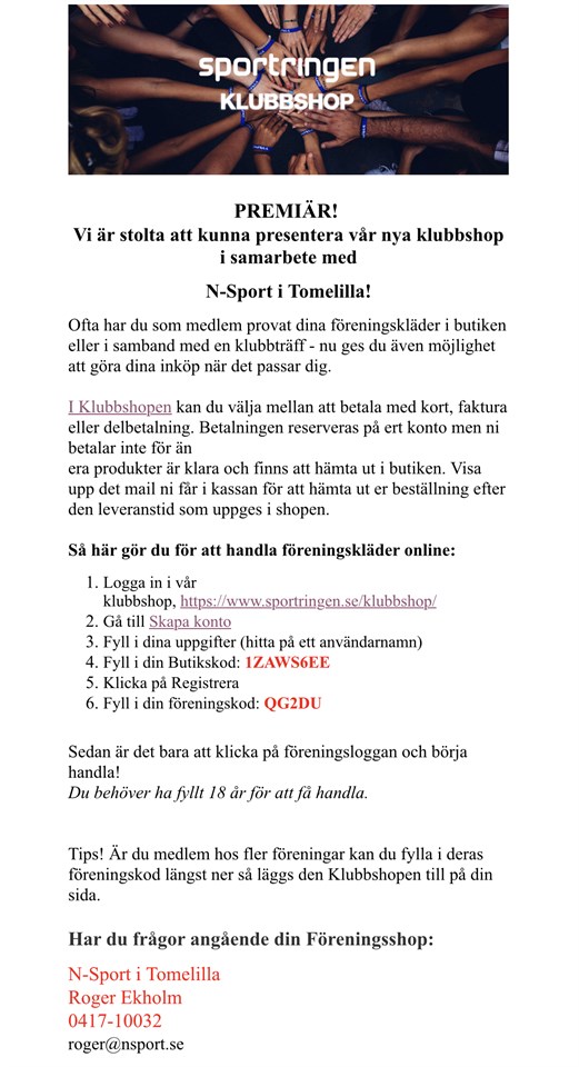 Wollsjö AIF och N-sport/ Sportringen Tomelilla lanserar nu klubbportalen där det går att köpa klubbens profilkläder. https://www.sportringen.se/klubbshoppen/ Vid beställning följ infobladet. Om ni vill prova kläderna innan så kommer det finnas möjlighet på Åvallen (idrottsplatsen) följande dagar: V.7 Tis 15/2 18.30-19.30 Ons 16/2 17.30-19 V.9 Tis 1/3 18.30-20 Lör 5/3 10-12