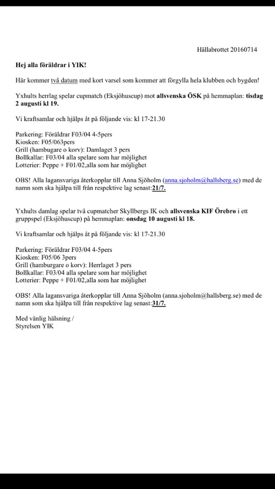 Yxhults herr- och damlag kommer att spela några roliga cupmatcher ganska snart (bl a mot Allsvenska Örebro SK och KIF Örebro) och till dessa så övriga av Yxhults ungdomslag fått uppgifter (parkering, kiosk, grill, bollkallar mm) tilldelade sig. Vårt lag har inte fått det denna gång, men om någon känner att de ändå har möjlighet att hjälpa till så kan man maila till michael_elgland@hotmail.com, alt sms till 070-2036783. Se bifogad bild för mer info. Hör av er senast 21/7 resp. 31/7 :) Det kan vara svårt att se all info på bifogad bild om man använder laget.se's App, men i vanlig webversion ska det fungera.
