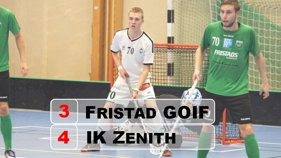 Omgång fem spelades i Borås skogar mot gamle bekantingen Fristad GOIF. Ett lag vi fick se oss slagna av senast det begav sig i Fristadshallen. Ett lag vi visste skulle bjuda upp till mer fysiskt spel än skönspel. En spelmässigt svängig men jämn match där segern först kunde säkras sju sekunder före matchens slut. Fristadshallen, en något mindre hall där både avbytarbänkar och utvisningsbås knappt ges utrymme. Fristad GOIF är hemmastarka och som är bekväma i hallen kan spela ut sitt spel till fullo. Ett fysiskt lag som kanske inte passar oss perfekt att möta. Vi visste detta sedan förra säsongens möte men är ändå inte med från start då Fristad GOIF tar tag i taktpinnen direkt. En målsnål första period som slutar 0-1 till hemmalaget. Fristad GOIF smäller på och ger oss inget utrymme att spela ut. Andra perioden bjuder inte på mycket skönspel eller mål heller. Först 19.20 kan Fredric Clywersköld sätta kvitteringsmålet med ett individuellt skickligt nummer. Tekningen därefter renderar i ett frislag för Fristad GOIF som spelar igång bollen snabbt. På ett tillslag har bollen hamnat hos en fri spelare och vår glädje blir kortvarig. 2-1 till Fristad efter två perioder. I tredje perioden är det Zenith som styr och ställer. Fristad fortsätter spela fysiskt men vi hittar nu lösningar och kommer till farliga lägen. På de fem inledande minuterna har vi vänt matchen till vår fördel. 2-3 till Zenith efter mål av Albin Jangeborg och Andreas Jillgart. Fristad kvitterar efter en markeringsmiss från oss. Därefter trycker vi åter på igen för ett ledningsmål. Ett mål som kommer sju sekunder före matchens slut där Albin Jangeborg på pass från Simon Elgan lyckas petra in den och glädjen går inte att ta miste på. De sista sju sekunderna spelas av och vi tar med oss tre, oerhört sköna, poäng hem till Göteborg. Segern är inte på något sätt orättvis. Vi skapar mängder med chanser och ska kunna göra mer än fyra mål. Fristad GOIF har en bra målvakt som räddar kvar dom i matcherna flera gånger. Denna seger innebär att Zenith är fortsatt obesegrade efter full tid. 11 poäng och en tredje plats i tabellen. En mycket glädjande sak är att Gustav Eurén och Fredrik Augustsson, båda födda 2003, gör debut i A-lagströjan. Skottstatistik 25-23 (5-6, 9-8, 11-9) Övrig matchstatistik hittar ni här Nästa match spelas hemma mot FBC Engelholm. Som vanligt, lördag klockan 14.00 i Björlandahallen.