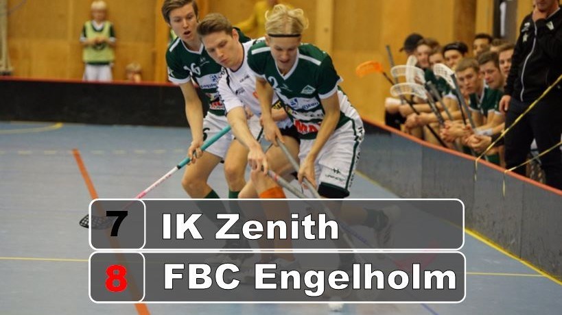 Trots stark upphämtning av ett 0-3 underläge så blev det till slut förlust med 7-8 mot ett för dagen starkt Engelholm. Zenith, som kom till matchstart utan förlust efter full tid på fem omgångar, var segervissa redan från start, det syntes tydligt. Glädje och bra fart på uppvärmning gjorde att en skön känsla infann sig. Engelholm kom till start med två raka förluster och var rejält sugna på en vinst vilket också syntes på banan där man krigade stenhårt i varje närkamp vilket också gav resultat. Det blev ev svag förstra period från hemmalaget, där gästerna kunde gå ifrån till en 0-3 ledningen och det kändes som vi inte alls kom upp i nivå. Många bolltapp i röd zon och ett hungrigt Engelholm var ingen bra kombo. Det skulle dock rättade till sig i andra perioden där det blev omvänt förhållande, hemmalaget vände och vann perioden med 3-0 och en skottstatistik på 14-3. Tredje periden blev jämn och båda lagen följdes åt och där Engelholms Jonathan Helmersson blev matchvinnare när han petade in 7-8 målet med 19.12 på matchklockan. Summerat blev det en förödande förstaperiod för hemmalaget och när vi sedan endast stundtals kommer upp i nivå så räcker det inte på denna nivån för att vinna matcher. Skottstatistik 33 - 23 (5-9, 14-3, 14-11) All övrig statistik hittar ni här Matchens lirare i Zenith blev Benjamin Borneklint som gjorde en riktigt bra insats! Bästa spelaren i bortalaget blev nr 27 Wictor Winqvist som även han fick motta matchens lirarepris. Nu får vi ta ny tag när vi åker ner till Aranäshallen på lördag för att återkräva en revansh på serieledande Varla. Matchen startar 15.45, hoppas vi ses!