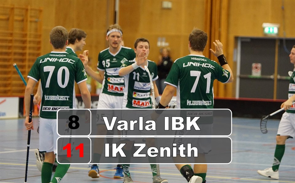 Omgång 7 spelades på bortaplan, närmare bestämt i Aranäshallen mot gamle bekantingen Varla IBK. Förra säsongen resultat, förlust med 14-3, fanns i bakhuvudet men fungerade bara som tändvätska till denna matchen. IK Zenith vinner matchen med 8-11 och bjuder Varla IBK på sin första förlust denna säsongen. Varla IBK visar tidigt att det kommer smälla på under matchen. De spelar fysiskt men drabbas också utav utvisningar. Redan efter 49 sekunder får de grönklädda chansen i powerplay och det utnyttjas av Fredrik Clywersköld som sätter mål nummer ett. Kristoffer Ivarsson utökar sedan till 2-0 när knappt fyra minuter är spelade. Drömstart! Perioden slutar 3-3 efter att Varla bjudits tillbaka in i matchen, något enkelt. Men matchen lever i högsta grad och någon upprepning av förra säsongens resultat känns inte nära. IK Zenith är med i matchen i högsta grad! I andra perioden böljar spelet fram och tillbaka. IK Zenith tar ledningen med 5-3 men Varla kommer tillbaka till 5-5. Simon Elgán trycker upp ledningsmålet, två minuter före periodens slut, innan Varla åker på en utvisning för hårt spel. En hård tackling i ryggen på Edvin Karlsson renderar i 5 mintuers utvisning vilket får bortalaget att tända till. Med vilda protester drabbas man också av en två minuters utvisning för protest. Det numerära övertaget utnyttjas till fullo av Zenith innan perioden är slut. Två mål och dessutom väntar drygt 3,5 minut powerplay i tredje perioden. Vi går till pausledning med 5-8. Men vad som borde resultera i mål i vår favör blir tyvärr tvärtom. Under de 3,5 minut vi ges chansen i powerplay släpper vi in ett mål innan Varla åter är fulltaliga. Efter 7 minuter gör så Varla också 7-8 och nerver smyger sig på. Men ett kontringsläge ges där Andreas Jillgart driver upp bollen och hittar Albin Jangeborg i full fart på bortre stolpen. Två måls ledning och lite andrum. Varla dominerar resten av perioden. Zenith slår ifrån och försöker låsa fast bollen högt upp i banan. Kedjan med Edvin Karlsson och bröderna Jansson står för ett sanslöst starkt arbete över hela banan och ser själva till att spela av flera minuter. Bägge bröderna får dessutom kröna sitt slit med varsitt mål i öppen kasse. Matchen slutar 8-11 och revanschen är fullbordad! Segern är inte orättvis. Trots ett bra presspel av Varla lyckas vi ofta lösa det med olika varianter och uppspel. Ett kvitto som visar på vad IK Zenith är kapabla till denna säsong, lika tydligt som förra veckans bottennapp mot FBC Engelholm visar var vi står när fokus ligger på fel ställe. Denna match är en vinst där kollektivet IK Zenith ska lyftas. Samtliga gör en bra insats men om någon ska lyftas fram så är det vår debuterande målvakt, Linus Gylling 17 år, som går in och gör debut i division 1 mot seriens bästa lag. Med hjälp av sina backar gör han en riktigt bra debutmatch, som dessutom får krönas med en assist till Måns Janssons mål i slutskedet. Ingen dålig debut, som lovar gott inför framtiden. Skottstatistik 24-25 (9-7, 7-10, 8-8) All matchstatistik hitt ni här Nästa match spelas borta mot FBC Malmö i Kirsebergs Sporthall den 16 november 15.00.