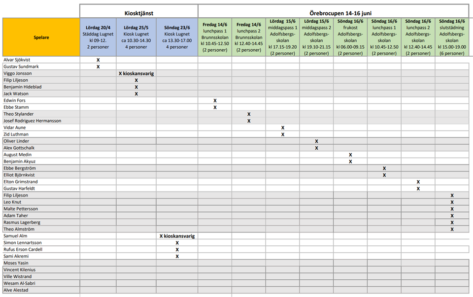 Hej! Se bifogat slutligt schema för arbetsfördelningen under Örebrocupen som Ida har sammanställt. Alla berörda vet redan vilka pass som gäller så detta är endast ett "för info" utskick till er alla. Viktigt dock att ni alla har koll på vilka pass ni ska ta. Stort tack för alla era insatser under Örebrocupen!! P2014 12 jun 2024 0kommentarer