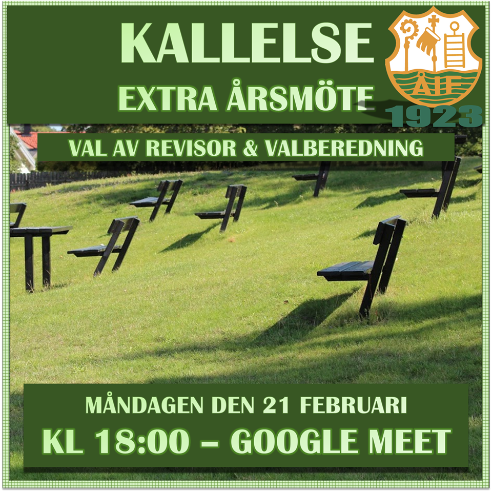 Kallelse till extra årsmöte. Interimstyrelsen i Åhus IF kallar härmed medlemmarna till extra årsmöte enligt nedanstående beskrivning. Tid och Plats: Det extra årsmötet hålls via Google Meet Måndagen den 21e februari, klockan 18:00 Mötets utlysning: Extra stämman kommer att kallas: -Dels via mejl till medlemmarna där mejladress finnes. -Dels på föreningens hemsida. -Dels anslås på Åhus I.P. i klubbstugan. På extrastämman kommer två punkter att behandlas. 1. Val av revisor 2. Val av valberedning Interimstyrelsen i Åhus IF vill med denna kallelse hälsa alla medlemmar välkomna till extra årsmötet. Länk till virtuell anslutning kommer att skickas ut på e-mail, till medlemmar, fredagen den 18e februari (med instruktion om hur man ansluter).