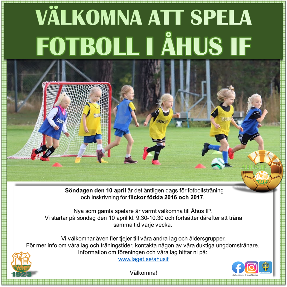 VÄLKOMNA ATT SPELA FOTBOLL I ÅHUS IF Söndagen den 10 april är det äntligen dags för fotbollsträning och inskrivning för flickor födda 2016 och 2017. Nya som gamla spelare är varmt välkomna till Åhus IP. Vi startar på söndag den 10 april kl. 9.30-10.30 och fortsätter därefter att träna samma tid varje vecka. Vi välkomnar även fler tjejer till våra andra lag och åldersgrupper. För mer info om våra lag och träningstider, kontakta någon av våra duktiga ungdomstränare. Information om föreningen och våra lag hittar ni på: www.laget.se/ahusif Välkomna! Åhus IF F2016