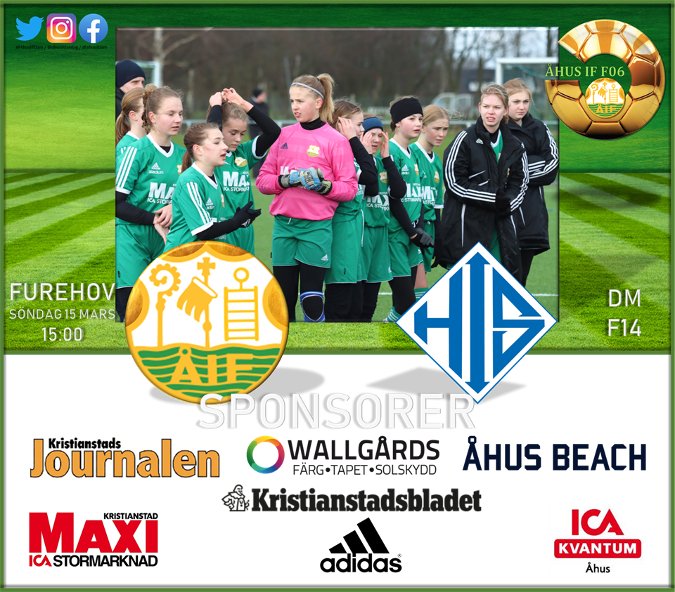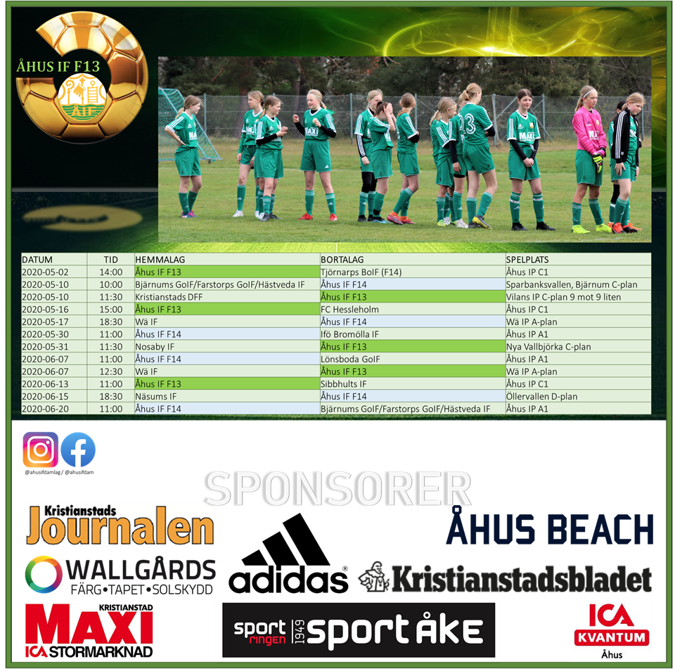 Spelschema våren 2020 Nu under maj & juni, kommer F06 & F07 spela tillsammans. Vi har ett lag i F06 serien, samt ett i F07 serien. Nedan är spelschemat som det ser ut just nu [någon match komma att behöva flyttas] Det kommer inte räknas något resultat eller tabell under våren och alla matcher är frivilliga. Matcherna ska vara publikfria enligt rekomendation från Skåneboll. Vi ska dock försöka sända, streama matcherna, så man kan följa matchen hemifrån. DATUM TID HEMMALAG BORTALAG SPELPLATS 2020-05-02 14:00 Åhus IF F13 - Tjörnarps BoIF (F14) Åhus IP C1 2020-05-10 10:00 Bjärnums GoIF/ - Åhus IF F14 Sparbanksvallen, Bjärnum C-plan 2020-05-10 11:30 Kristianstads DFF - Åhus IF F13 Vilans IP C-plan 9 mot 9 liten 2020-05-16 15:00 Åhus IF F13 - FC Hessleholm Åhus IP C1 2020-05-17 18:30 Wä IF - Åhus IF F14 Wä IP A-plan 2020-05-30 11:00 Åhus IF F14 - Ifö Bromölla IF Åhus IP A1 2020-05-31 11:30 Nosaby IF - Åhus IF F13 Nya Vallbjörka C-plan 2020-06-07 11:00 Åhus IF F14 - Lönsboda GoIF Åhus IP A1 2020-06-07 12:30 Wä IF - Åhus IF F13 Wä IP A-plan 2020-06-13 11:00 Åhus IF F13 - Sibbhults IF Åhus IP C1 2020-06-15 18:30 Näsums IF - Åhus IF F14 Öllervallen D-plan 2020-06-20 11:00 Åhus IF F14 - Bjärnums GoIF/Farstorps GoIF/Hästveda IF Åhus IP A1