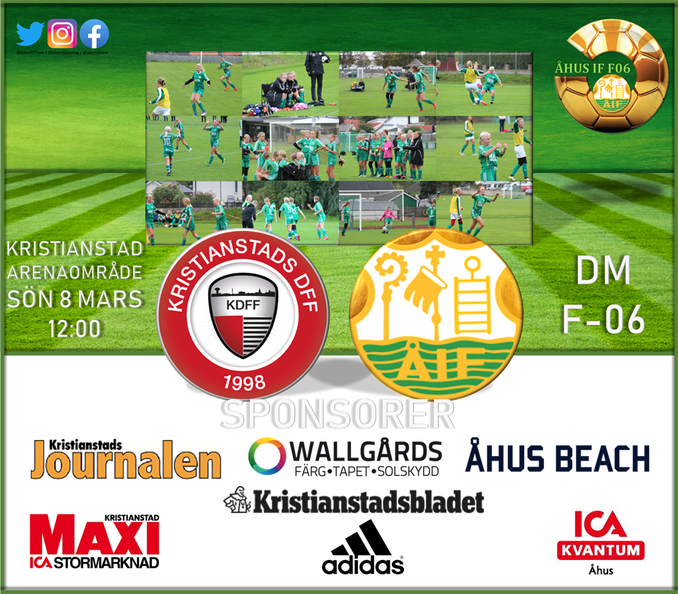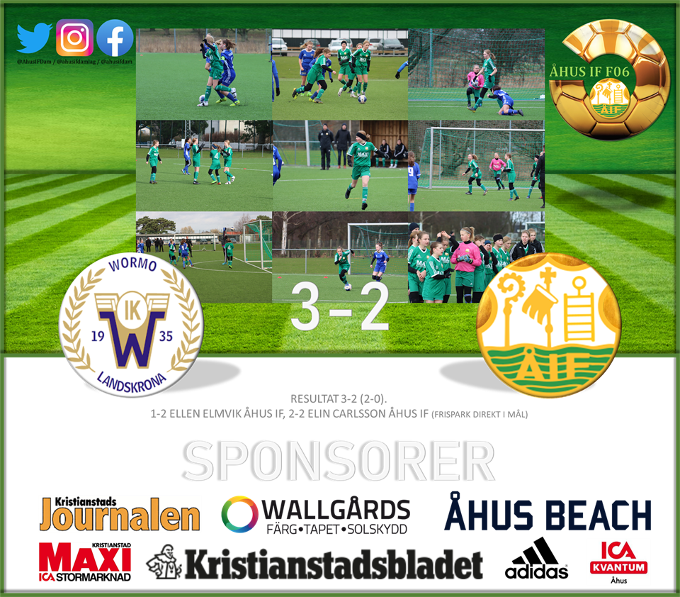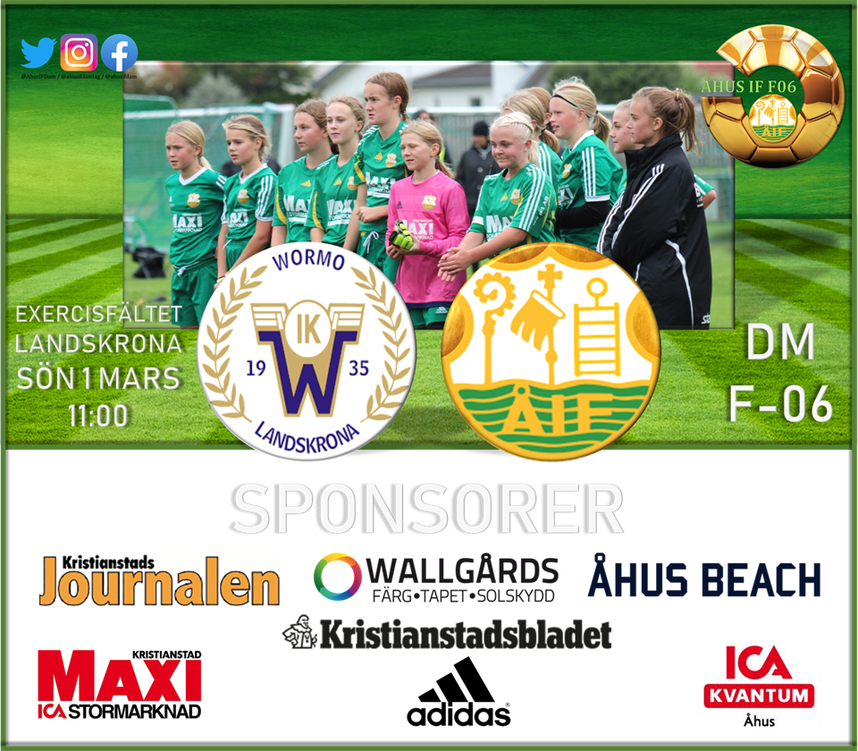Första matchen i DM för F14 - IK Wormo-Åhus IF Söndagen den 1e mars möter Åhus IF IK Wormo (Landskrona) i första gruppspelsmatchen i DM. Plats: Excerisisområdet Landskrona, konstgräs Tid: 11:00 F07 kommer stötta upp F06 under DM-matcherna. Denna match är det Lisa,Lexie, Wilda, Moa, Ellen & Emilia från F07 som spelar med F06. Spelprogram DM F14