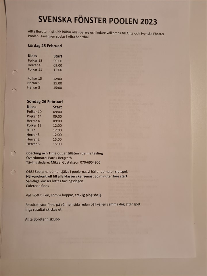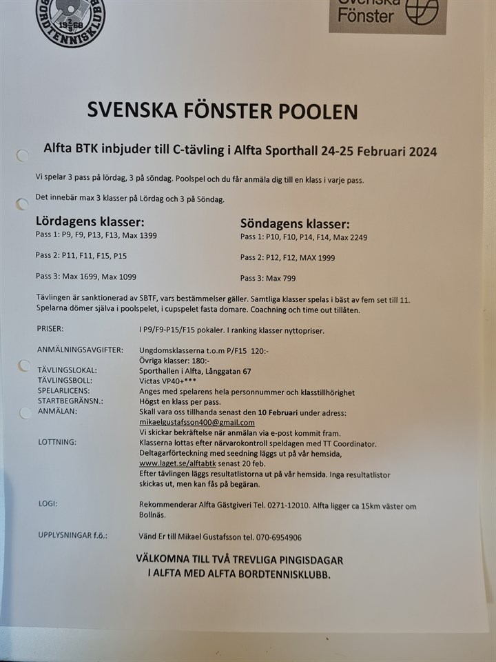 Nu ligger inbjudan till Svenska Fönster Poolen 2024 under fliken Dokument och i Mappen Svenska Fönster Poolen 2024. Den spelas 24-25 februari , sista anmälningsdag 10 februari. Alfta BTK 15 jan 2024 0kommentarer