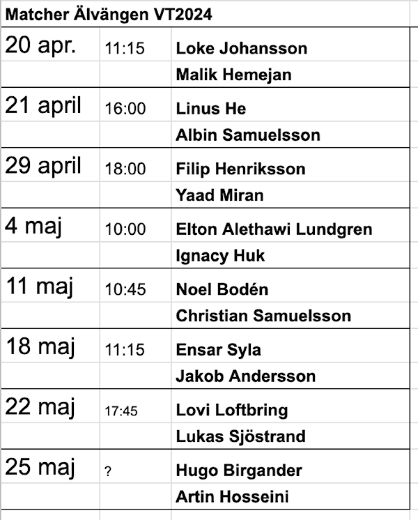 Jag blev uppmärksammad på att schemat på laget.se inte helt stämde. Någon/några matcher har lagts om och jag kan ha gjort någon miss. Men nu hoppas jag att det stämmer.