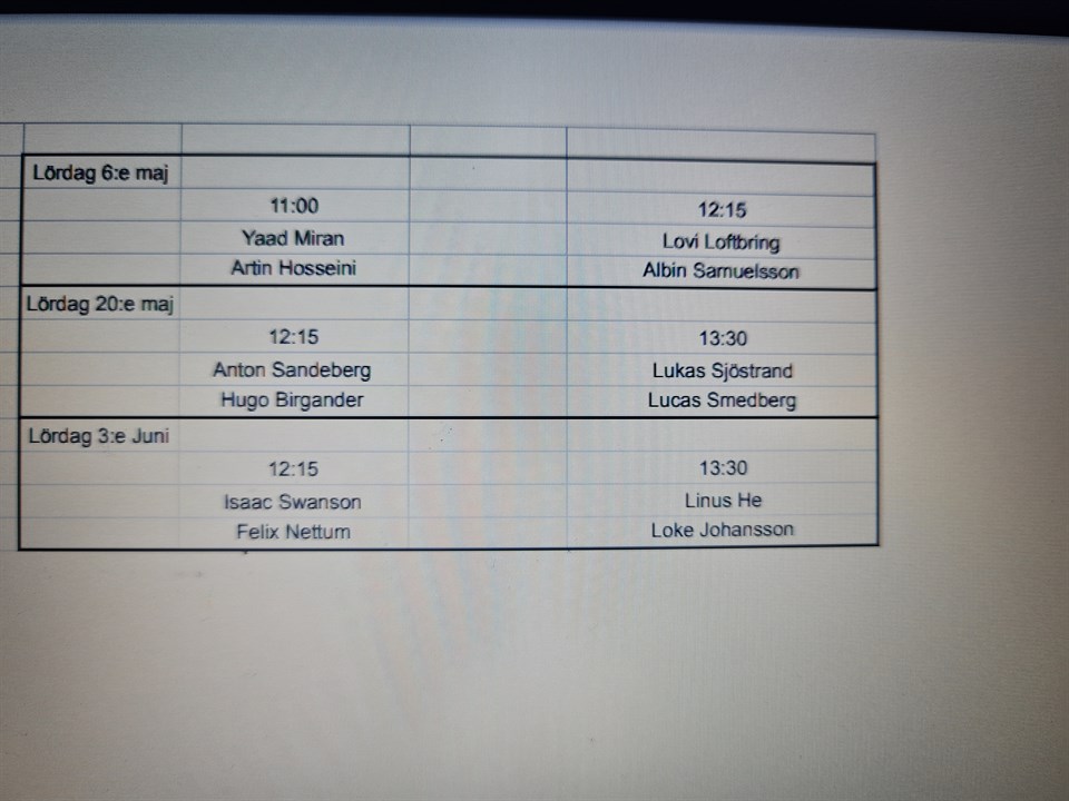 På lördag har vi två matcher. Vi samlas där (Tuvevallen i Tuve) 30 minuter innan matchstart. Alla kommer tyvärr inte få spela utan det är de grabbar som har högst träningsstatistik. Lagen är: Lag Blå Samling 15:15. Avspark 15:45. Hugo Felix Emil B Lovi Max Noel Linus Loke Filip Holmberg Arvid Lag vit Samling 16:30 avspark 17:00 Emil L Filip Henriksson Albin Malik Lukas Sjöstrand Lucas Smedberg Jakob Elias Sjöbeck Elton Oliver