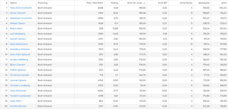 Hej alla Nu har det varit 2st helger med liga spel och med detta tänkte jag bjuda på lite siffror att kolla på :D Bästa slagning: Micael Dahl 810 Högsta serie: Robin Nero 248 Snitt efter dessa spelade matcher finns att se i bilden jag skickat med. Bra spelat av alla i helgen och ett stort grattis till B-Laget som idag tog säsongen första serger borta mot KKT. Grattis bra spelat av alla. Bwk Ankaret lagsida 21 sep 2025 0kommentarer