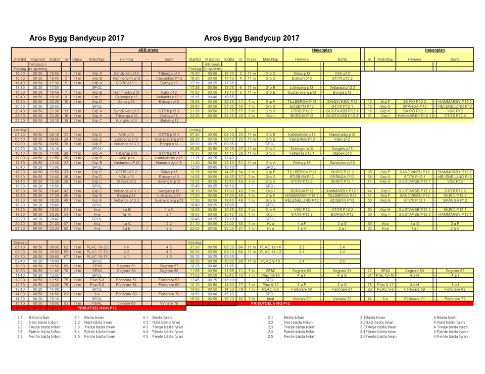 Semestrarna är över och skolorna börjar så smått denna vecka. Vissa har börjat med bandyn och andra har ännu inte startat upp säsongen. Årets startfält ser ut som följer: P12 (16 st) Borgia, Edsbyn IF, GT76 1, GT76 2, GT76 3, Gustavsberg 1, Gustavsberg 2, Hammarby 1, Hammarby 2, SAIK, Spånga, SKIRÖ 1, SKIRÖ 2, TB-Västerås, VSK, Helenelund. Reserver: Vetlanda, Köping P13 (20 st) Borgia, Derby, Edsbyn, GT76 1, GT76 2, Gustavsberg, Hammarby, Kalix, Katrineholm, Kungälv, Lidköping, SAIK, Selånger, Sirius, Stabek, TB-Västerås, Vetlanda 1, Vetlanda 2, VSK, Västanfors, Reserver: Nässjö, Botnia (FIN) Tidsplan: Oktober Ett cupprogram kommer att skickas ut ca 1 månad innan cupstart. Ett första spelschema kommer att distribueras tillsammans med programmet. Deltagaravgiften skall vara betald 2017-10-25 November Fredag 10/11 Incheckning vid cupkansliet samt på skolan. Senaste spelprogram erhålls vid incheckning i välkomstkuvertet. Övrig info: Kom ihåg att anmäla kontaktperson under cupen (helst 2 st) inkl mobilnummer. Kom ihåg att anmäla färger på ordinarie ställ respektive reservställ helst mer än en månad innan cupstart så vi får med det i programmet. Slutreglering av antal deltagare spelare och ledare och deras deltagaravgifter sker vid incheckningen. Ev betalning av tillkommande spelare/ledare kan ske med swish eller kort eller kontant. Återbetalning om man betalt för fler än de som checkar in görs till PG/BG eller konto. Har man anmält sig och checkat in och sen inte fullföljer cupen så sker ingen återbetalning av deltagarvgiften. Lagavgiften = anmälan återbetalas ej i något fall. Mat serveras på skola och Rocklunda bistro. Mat serveras endast till de som har deltagararmband eller matbiljett (medföljande). Deltagararmband och ev matbiljetter ligger i välkomstkuvertet. Extra band/matbiljetter kan köpas i cupkansliet. Välkomna till cupen!