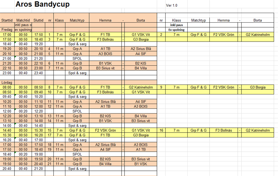 Plac 5-6 Match 31 PF 12 08,00 KVBS-VSK 1 Plac 7-8 Match 32 PF12 08,00 VSK 2-VIK Final Match 33 PF12 08,50 TB-Sirius 2 3:e pris Match 34 PF12 08,50 Sirius 1-Edsbyn Semi Match 35 PF13 10,20 Semi BOIS-Solberg Semi Match 36 PF13 11,10 Semi KIS/KVBS-SAIK Plac 11-12 Match 37 PF13 12,00 GT76-VSK Plac 9-10 Match 38 PF13 13,10 Villa 1-Bois F13 Plac 7-8 Match 39 PF13 14,00 Helenelund-Stabek Plac 5-6 Match 40 PF13 14,50 Villa 2-TB 3:e pris Match 41 PF13 16,00 Förlorare 35-Förlorare 36 Final Match 42 PF13 17,10 Vinnare 35-Vinnare 36
