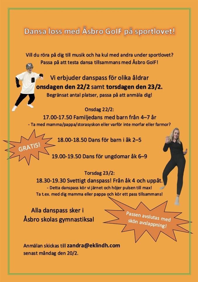 På lovet (v.8) pausar vi denna dansklass med dans för hälsa! Men Åsbro GoIf erbjuder lovdans för alla barn/ungdomar från 4 år och uppåt med familjer som även barn från denna grupp såklart får anmäla sig till! Se bilden för klasserna vi erbjuder under lovet. Tillägg i informationen: onsdag kl 17.00-17.50 riktar sig till barn från 4 år till åk 1, det gör alltså inget om man fyllt 8 redan! :) Mejla mig på zandra@eklindh.com för anmälan. V. 9 kör vi på som vanligt! Dans 2012-2017 15 feb 2023 0kommentarer