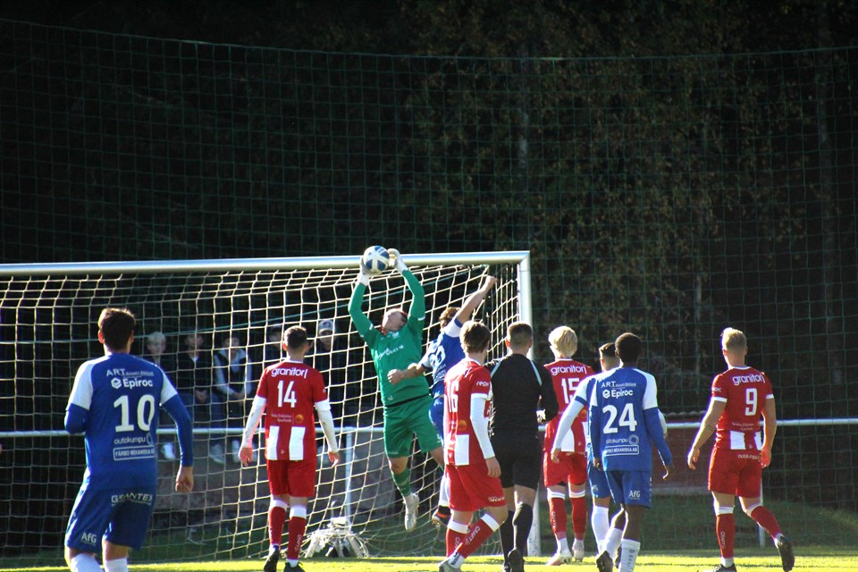 FAGERSTA. Det blev förlust i söndagens bortamatch mot Fagersta Södra med 2-1 (2-0), och nu väntar en oviss sista omgång, där det kan bli allt från kval, nedflyttning, eller vi tar upp oss på säker mark. ”Klubben” verkade tyngda av stundens allvar, och underpresterade och var egentligen långt ifrån att få med sig några poäng. Vi kan tacka målvakten Sebastian Lundvall för att förlusten inte blev större. -Vi gör en bra match, men har svårt att komma till lägen, säger ”Sebban” efter slutsignalen. Inför den sista omgången, när vi möter Årsunda som inte har någonting att spela för, ligger vi på negativ kvalplats. Huge, en poäng bakom AAIK, möter Forsbacka som är med kampen om en positiv kvalplats. Tredje laget i streckdramatiken, Bollnäs som har två poäng fler än Avesta, tar sig an avsågade Forssa. Upplagt för stor dramatik med andra ord. Assisterande tränaren Christian Gauffin Eriksson, var dämpad efter förlusten. -Det gick inte våran väg. Synd då vi hade chansen att få allt i egna händer till sista omgången. Vi blir ängsliga, förlorar andra bollarna, får inte fast bollen, och får korta anfall, säger han. Fagersta kunde med två mål inom ett par minuter i slutet av första halvlek, gå fram till en 2-0 ledning. I den andra halvleken reducerade Mergim Ramadani till 2-1, efter 60 minuter. Vi hade sedan inte förmågan att riktigt vaska fram någon kvitteringschans, utan Fagersta kunde enkelt hålla undan och ta andra derbysegern mot AAIK. Onsjövallen bjöd på ett krispigt höstväder. Inledningen av matchen var händelsefattig,även om vi inledde ganska bra första kvarten, då vi vann en del närkamper. Men sedan kom mycket att handla om hemmalaget,som tog över spelet efter tjugo minuter och började krypa närmare ett ledningsmål. Serge Hermann låg bakom mycket framåt. Närmast mål för bortalaget, var det när Albert Orre vek in centralt, men avslutet gick en meter över ribban. Södra tog rättvist ledningen med 1-0 (41) genom Mehdi Hosaini, framspelad av Hermann. Två minuter senare ökade Fagersta på till 2-0 genom Aaron Granqvist, som kom före Tony Nilsson vid bortre stolpen, på Teddy Abimans inspel. -Spelmässigt är vi med, men det är slarv av oss när de får göra sina två mål, säger Lundvall, och fortsätter: -Vi blir trötta sista tio, och de kommer igenom enkelt. Vid första målet går jag lite för hårt på, ser inget då Tony (Nilsson) är lite ivägen, och de lägger in den i första. Vid det andra backar jag ner, och den ska jag ta. Den vill jag ha tillbaka, säger Lundvall som i sin frustration sparkade i målställningen efter det insläppta målet. AAIKs ledarstab visade handlingskraft, när man gjorde tre byten i halvtid, när Taher Saleh, Mergim Ramadani och Albert Orre byttes in. Men det gav föga effekt då det var Fagersta som fortsatte äga matchen. -Vi ville ändra om, och vi vet att vi har en bra bänk, förklarar Christian bytena. Efter timmen spelad, låg i alla fall två av inhopparna bakom när Klubben reducerade till 2-1, när Mergim Ramadani nickade in Adam Tummas frispark. Avestas målvakt, som var lagets bästa spelare, och fick också pris som bäste AAIK spelare. -Vid 2-1 får vi lite energi, men vi har svårt skapa lägen. De blir lite stirriga och backar hem. Det är surt, säger Lundvall, efter den jobbiga förlusten. Avesta lyckades efter sitt reduceringsmål inte få någon energi sista tjugo, istället var det Fagersta som skaffade sig många frisparkar och hörnor, och fick fast bollen på AAIK:s planhalva. Lundvall visade klass när han räddade en frispark med dryga tio minuter kvar, som var på väg in i krysset. På tilläggstid visades Taher Saleh ut för snack med domaren, och missar därmed matchen mot Årsunda. -Vi ville ändra spelsystemet, och det öppnar upp sig bakåt. De har inget att spela för, men de vill vinna, då det är derby, säger Gauffin Eriksson. I slutminuten stack Lundvall från eget mål, upp i motståndarboxen, när vi fick en frispark. Men symptomatiskt för denna match, ledde det inte till något farligt, då frisparken träffade närmaste Fagerstaspelare. ”Sebban” Lundvall, har svårt att förklara varför laget inte kom upp i vår nivå. -Vi kan betydligt bättre, kanske att vi var nervösa. Gräsmattan var fin, lite hal kanske, men den kan vi inte klaga på. Christian Gauffin Eriksson funderar framåt mot nästa lördag, då vi lägger allt fokus på hemmamatchen mot Årsunda i en ödesmatch. -Vi ska göra vårt. Det kommer att bli spännande , och nu får grabbarna visa karaktär, och visa upp sitt bästa. BILDEN. Sebastian Lundvall, tillhörde en av av "Klubbens" bästa spelare i derbyt mot Fagersta Södra. Foto: Pirjo Korhola. Text: Per Lindgren. Fagersta Södra IK-Avesta AIK 2-1 (2-0) Målen: 1-0 Mehdi Hosaini (41), 2-0 Aron Granquist (43), 2-1 Mergim Ramadani (62). Hörnor: 8-0 (4-0) Utv, Avesta: Taher Saleh (90+1) Varningar, Fagersta: Karl Södereng. Avesta: Johan Lindgren. Domare: Nedin Prguda. Publik: ca 250 (Onsjövallen) Avesta AIK: Sebastian Lundvall-Philip Bergstrand, Johan Lindgren, Filip Hedblom, Tony Nilsson (46 Mergim Ramadani)-Simon Tella (46 Adam Tumma), Rasmus Lindgren, Jakob Svedlund (87 Noel Hildensjö), Benjamin Larsson (46 Taher Saleh)-Albert Orre, Viktor Hansson (62 Hugo Sjögren). Ersättare: Malik Abdulrahman, Kushtrim Krenzi.