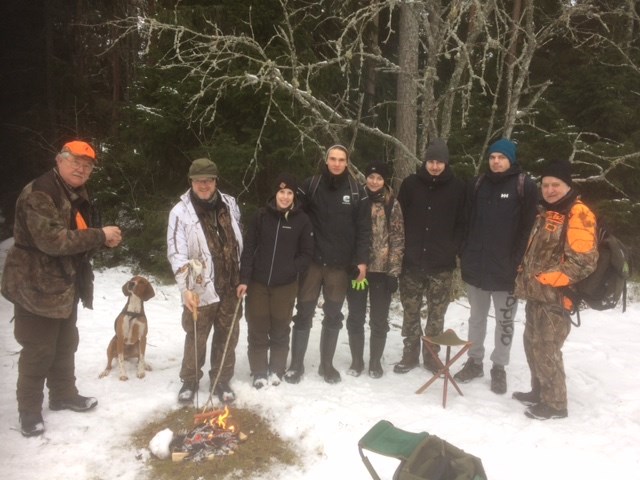 Söndagen den 11 februari 18. Gick årets ungdomsjakt på Räv och Hare av stapeln. Ett tiotal förväntansfyllda ungdomar hade samlats vid Ekebyboda, utanför Uppsala. 3 stövare hade kallats in för dagens jakt. Ungdomarna delades upp mellan pass skyttar och hundförare. Jakten kunde börja. Finnstövaren Sisu, började snart väcka och en hare var snart på benen. Haren passerade strax ett av generalpassen, där kretsdordföranden och två jägarskoleelever stod på pass. Haren fick dock passera oskjuten. Den visade sig vara en "stänkhare". Drevharen drog iväg på Nybyskogen.. Drevet vände dock strax och kom närmare o närmare.. Strax dök en räv upp, det visade sig att stövaren bytt drevdjur. Skottet uteblev dock och drevet buktade vidare. 4 kron hindar stördes av drevet och kom majestätiskt travande över Prästgårdsmyran.. efter några bukter kom drevet åter mot generalpasset... Denna gång klarade sig räven pågrund av en ringande jourtelefon..... Dom andra 2 stövarna tog båda upp hare och klingande drev kunde höras, ett skott avlossades, men haren kunde förskräckt återvända till skogen lungna vrå... Dagen avslutades med korvrillning och genomgång av dagens jaktupplevelser ! Ett stort Tack till Åkerby-Börje och Börje Östra Jaktlag, samt Hundförarna Ingemar Hjelmstedt, Nils Hernvall och Mats Norlin.