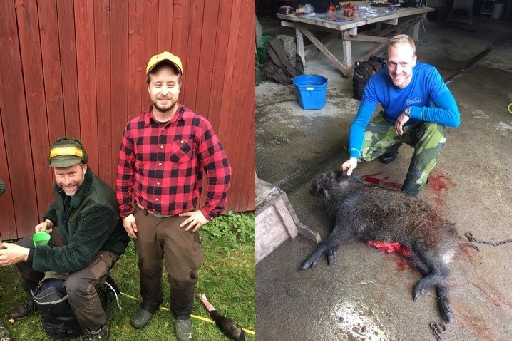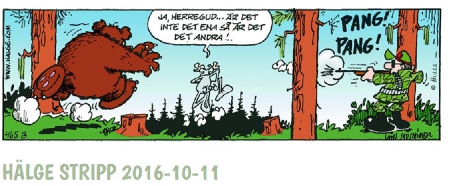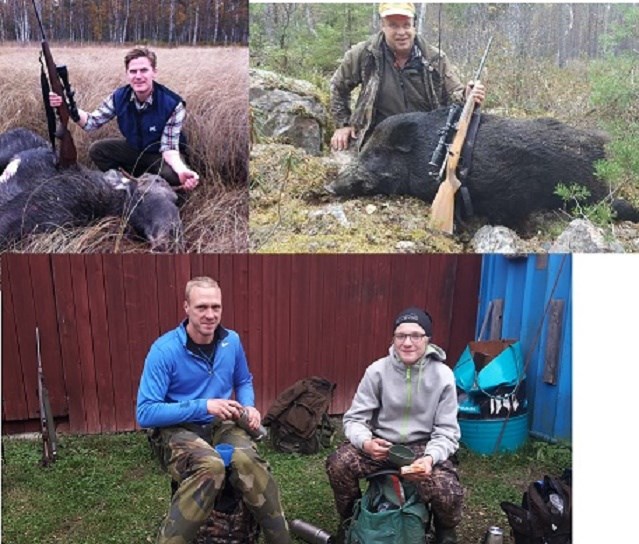 Då Thomas stötte ett gäng över landsvägen vid Krogen igår så satsade vi på Åkerbymoss-området på förmiddagen. Det stod inte på så hade Lars-Erik ko och kalv på sig i pass 27 men fick inget skottläge. Vox tog upp jakten och tryckte fram dem till Conny som satt vid masten. Där blev det stopp för kalven och samtidigt bestämdes att vi nu har koförbud och bara skjuter kalvar, detta för att spara den numera ensamma kon. Faktum är att detta är den första ko och kalv vi ser under jakten så det känns helt rätt att spara de hondjur som möjligen finns på marken. Sedvanlig korvgrillning och ompostering, lite mer betoning på Blackstavallsområdet nu. Tomas gick och bandade uppifrån Bergaäng och det stod inte på förrän ett skott hördes därifrån. Ett vildsvin skjutet och sex-sju stycken som stack iväg hördes över radion. Det dröjde inte så länge så föll ytterligare skott och det visade sig vara Tobias i pass 11 som fick ner två vildsvin på sig varav ett blev kvar för gott. Vox tog sig an det andra vildsvinet och drev det runt marken från Lortmossen och upp runt och förbi Mossbo. Nåväl den klarade sig och dagen avslutades efter en älgkalv och två vildsvin skjutna. Vid samlingen beslutades att vi avvaktar med älgjakten ett tag. Det har verkligen inte kryllat av hondjur och kalvar på markerna så det känns helt rätt att avvakta åtminstone tills vi ser att det finns gott om dem igen.