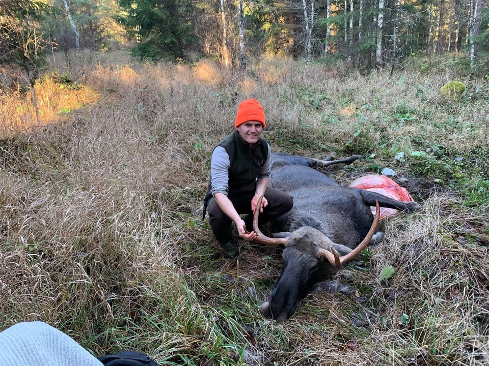 Samma fina väder andra dagen också. Ungdomsjakt på Granmarken - Bromosse området idag. Efter lugn inledning på dagen smäller det plötsligt, först hos Erik i pass 37 och därefter hos Mats som satt sig i pass 35. Hos Erik blev en fyrtaggare kvar medan Mats fick en kviga.