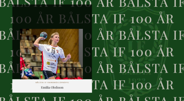 Namn: Emilia Olofsson Ålder: 19 år (2002) Antal år som aktiv i handbollen: 13 år Idag aktiv i: Skånela IF dam Position/roll: 9m-spelare Antal år i Bålsta IF: 8 år Bästa Bålsta IF minne: När vi vann Partille Cup B-final! En tränare/ledare som varit viktig för mig: Min mamma, Petra Talamo, som var med från början till slut och tränade oss alla år i Bålsta IF. Men också Marcus Pettersson och min pappa Anders Olofsson som var med mer de sista åren och bidrog med mycket vilja och glädje! Mitt bästa råd till unga handbollsspelare: Tro på dig själv! Se till att du är i en miljö där du trivs och utvecklas, kom ihåg att det ska vara roligt att spela handboll! Hälsning till Bålsta IF: Tack för alla sköna år i den gröna tröjan och alla minnen som jag bär med mig resten av livet. Utan Bålsta IF hade jag inte varit där jag är idag! Bålsta IF 25 nov 2022 0kommentarer