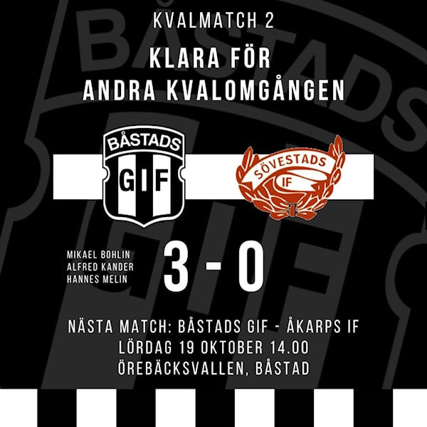 - Återigen en väldigt bra start av oss vilket gör att vi kan ta ledningen i redan 6:e minuten via Micke Bohlin. Första målet var såklart väldigt viktigt, då vi hade med oss en tvåmålsledning från mötet i onsdags, och gjorde att vi då var i en betryggande tremålsledning. Vi fortsätter att rada upp fina målchanser i första halvlek utan att få dit bollen så 1-0 står sig till halvtid. I början av andra är Alfred Kander påpasslig på en målvaktsretur och sätter 2-0. Med vår fyramålsledning i början av andra så dör matchen och blir en, för oss, väldigt avslappnad tillställning med fokus på att undvika skador och avstängningar inför andra kvalomgången. Innan domaren blåste av hann dock Hannes ”Iceman” Melin med att göra ett riktigt klassmål med ett kanonskott som var helt otagbart för målvakten. Min summering av dubbelmötet är att vi är det klart bättre laget i de båda matcherna vilket också det totala resultatet på 8-3 i vår favör speglar. Kvalomgång 2 startar på lördag när vi välkomnar 10:an i Sydvästra fyran, som är Åkarps IF, till Örebäcksvallen. Vi hoppas på lika mycket publik som mot Sövestad och kommer göra vårt yttersta för att ta vår nionde raka hemmavinst.