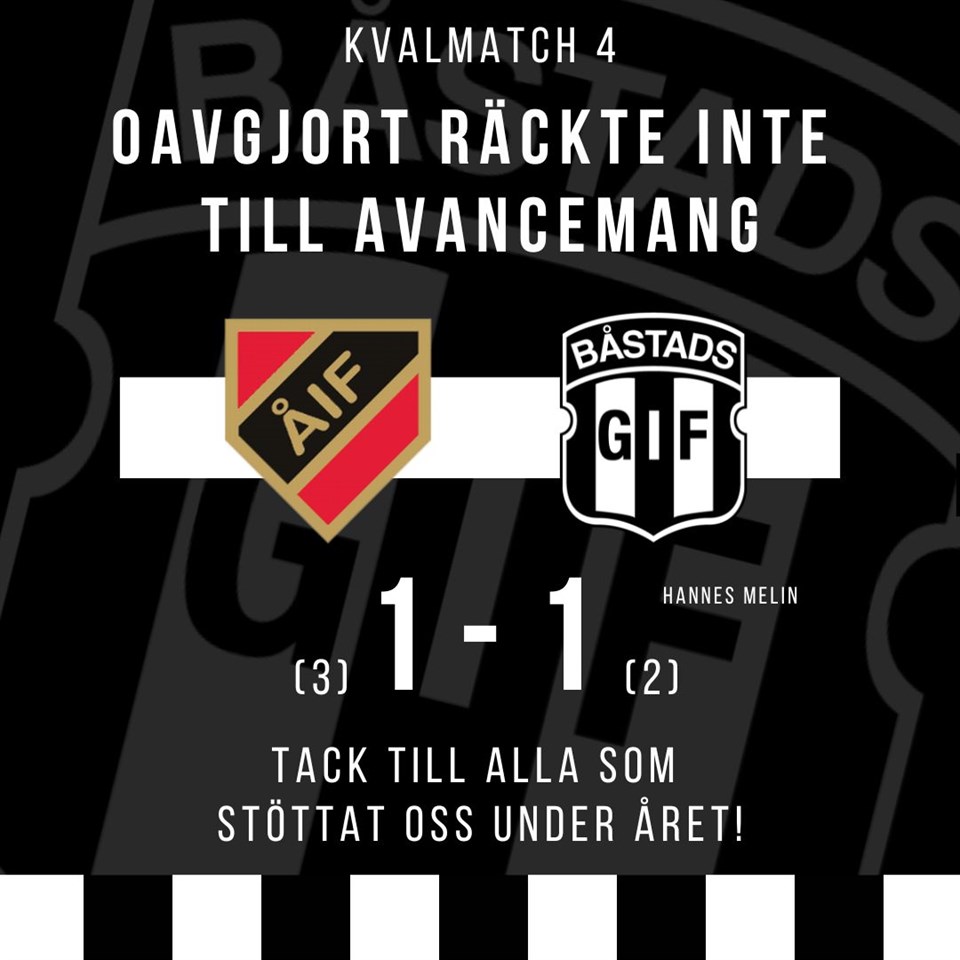 - Vi vet att Åkarp är ett bra lag och de lyckas i första halvlek effektivt sabotera våra försök till ordnat anfallsspel längs med marken vilket gjorde att vi tvingades till en hel del längre bollar som deras backlinje effektivt tog hand om. I halvlek gjorde vi en del förändringar i spelet och fick också ett betydligt bättre offensivt spel vilket gav oss många hörnor, frispakar och inkast i bra lägen. Efter en fast situation i 61:e minuten hamnar bollen på en Åkarp arm och domaren pekar på straffpunkten. Hannes ”Iceman” Melin gör som vanligt inget misstag och vi tar ledningen med 0-1 och dubbelmötet är utjämnat. Tyvärr replikerar Åkarp och gör 1-1 fyra minuter senare efter en tilltrasslad situation i vårt straffområde och vi är återigen i sammanlagt underläge. Jag tycker att vi därefter forcerar på ett bra sätt och skaffar flera bra målchanser via hörnor och långa inkast men Åkarps målvakt imponerar med några riktigt fina räddningar. Summa summarum så faller vi med minsta möjliga marginal i dubbelmötet vilket såklart känns surt. Samtidigt så kan jag inte vara annat än väldigt nöjd över killarnas insats denna säsong där vi kommer tvåa i serien, för första gången på länge är bäst i kommunen och missar uppflyttning i andra kvalomgången med minsta möjliga marginal mot ett division 4 lag från Malmö. Jag vill å hela truppens vägnar också tacka för det fina stöd vi haft hela säsongen av våra supportrar. Epilogen idag i Åkarp var inget undantag utan det kändes som att vi spelade på hemmaplan. Vi ses nästa säsong!