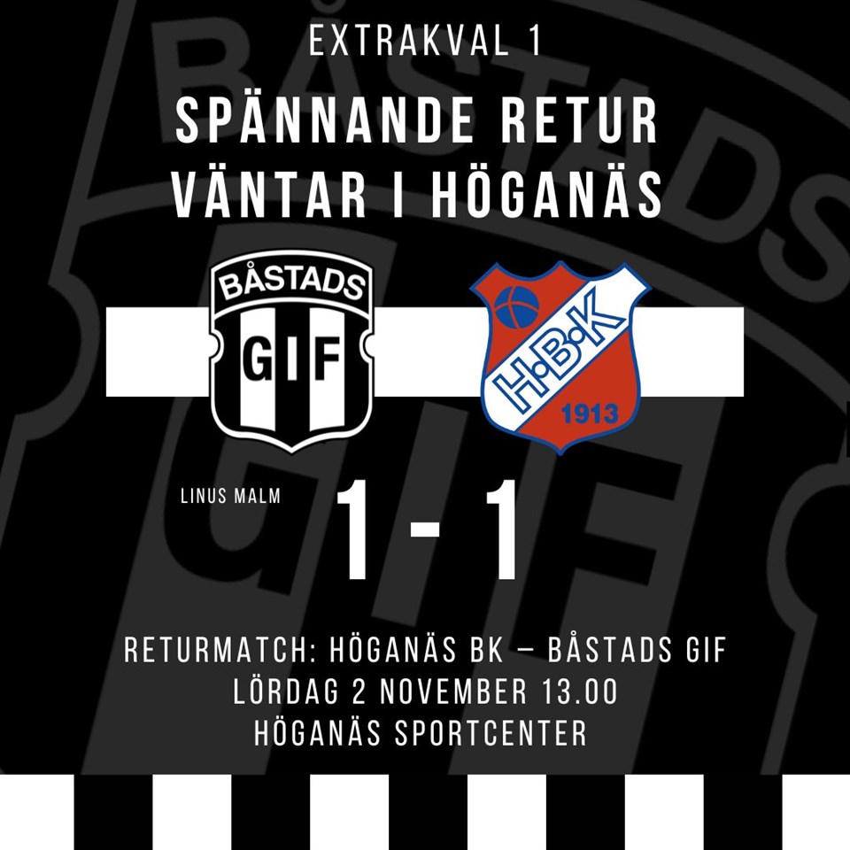 - Höganäs kommer ut starkt och tar rättvist ledningen i 16:e minuten. I 27:e minuten får vi en frispark på offensiv planhalva som Filip Larsson curlar snyggt mot bortre krysset och efter lite tumult är Linus Malm framme och stöter bollen i mål till 1-1. Efter kvitteringen tar vi över och får momentum resten av halvleken utan att lyckas kapitalisera på vårt övertag. Andra halvlek blir en jämn historia där vi inleder starkast och skapar några riktigt bra chanser men där Högnäs äter sig in i halvleken och jämnar ut spelet och chanserna i slutet av matchen. Summa summarum en jämn tillställning med ett logiskt oavgjort resultat vilket gör lördagens retur i Höganäs till en riktigt spännande tillställning. Vi kommer göra vårt yttersta för att dra längsta strået och spela i division 4 nästa säsong. Vi ses på Höganäs Sportcenter kl 13:00 på lördag för en minst sagt spännande retur!