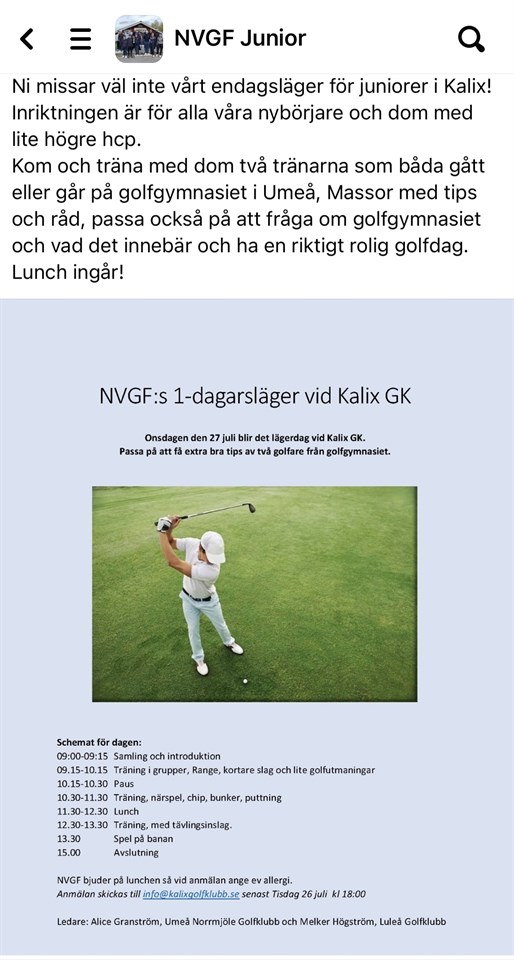 Hej alla. Söndagen den 4/9 går finalen för årets NVGF Junior Tour av stapeln här i Boden. Tävlingen är öppen för alla juniorer med grönt kort oberoende om man varit med i träningsgrupp under sommaren eller spelat någon av tävlingarna tidigare i år. D-klass Hcp 36,1 - 54 9 hål Poängboggey. C-Klass Hcp 23,1 - 36,0 18 hål Poängboggey B-klass Hcp 6,0 - 23,0 18 hål Slaggolf A-klass Hcp +8,0 - 12,0 27 hål Slagspel ( minimiålder 13 år) Anmälan görs själv via Min Golf Nu när finalen äntligen är tillbaka i Boden hoppas vi att många Bodenjuniorer passar på att spela. Vi kommer även behöva markörer. Så vuxna som kan gå med i en boll räkna slag och hjälpa till med att föra scorekort får gärna höra av sig till ungdom@bodensgk.se Barn och Ungdom 22 aug 2022 0kommentarer