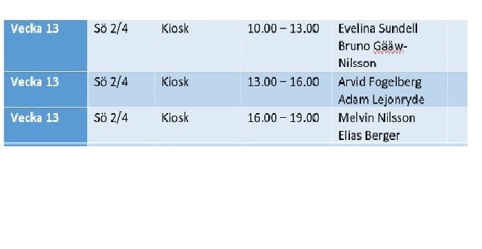 Vecka 13 dvs nästa vecka är det dags för Team 08 att ha hand om kiosken! Då A-lagets spelsäsong nu är över samt att Team 07 har Bålstacupen på lördag den 1 april och i och med detta driver kiosken själva så innebär det att kiosken endast behöver bemannas av oss i Team 08 på söndag 2 april mellan kl 10.00 – 19.00, se schema nedan. PS. Om ni har bytt bort er tid med någon annan så hjälp till att påminna varandra om detta. Detta schema, nedan, är ursprungsschemat. Jag vill också passa på och tacka alla föräldrar som ställt upp med kioskarbetet under denna hockeysäsong. Vet att det var lite ”läskigt” i början för några av er (inkl mig själv) som aldrig hade stått i en kiosk förut. Men tillsammans har det gått jättebra och vi har hjälpts åt vilket är jättebra! Kiosken är en viktig inkomstbringare för BHC klubben och ju mer pengar vi hjälps åt med att få in till klubben, via ex kiosken, desto mer kan klubben hålla nere barnens avgifter för hockey – och det vill vi ju eller hur?! Vänliga Hälsnigar Åsa, Kioskansvarig Team 08/09 22 mar 2017 0kommentarer