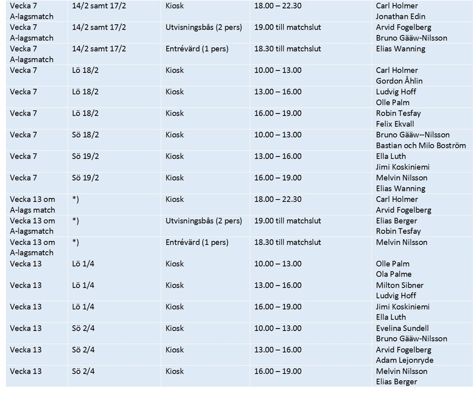 Hej alla föräldrar i Team 08 Jag har idag fått information om vilka tider som gäller för vår hockey kiosk vid våra A-lags matcher. När vi skrev schemat så visste jag inte att vår kiosk ska vara öppen 1,5 timme före A-lags matchen börjar. Dvs börjar matchen kl 19.30 (vilket den kommer att göra vecka 7 när Team 08 har hand om kiosken) så innebär det att de personer som står i kiosken ska vara på plats redan kl 18.00 (ej kl 19.30 som det står i schemat). De personer som står som entrévärdar ska vara på plast 1 timme innan matchen börjar (den informationen hade jag redan fått). När det gäller bemanningen i utvisningsbåset så ska utvisningsbåset bemannas 30 minuter innan matchens början. Dvs börjar matchen kl 19.30 så ska de personer som ska jobba i utvisningsbåset vara på plats redan kl 19.00. En annan sak som jag vill förtydliga är att som ni säkert har noterat så är det två A-lags matcher vecka 7 när det är vår kioskvecka. Det betyder att de som är uppsatta att ansvara för utvisningsbåset, entrévärd och bemanna kiosken – får äran att jobba som det två gånger den veckan dvs den 14/2 samt den 17/2. GRATTIS! Matcherna börjar som meddelats tidigare kl 19.30 – och nu vet ni ju när ni ska vara på plats. Rutiner för ex entrévärd, sitta i utvisningsbås finns under laget.se – dokument. Hittar ni det inte så hör av er eller maila mig - så mailar jag ut det till er. PS. Om ni alla lämnar in era mobilnummer till Kim så kan jag påminna er via SMS när ni ska stå nästa gång i kiosk, utvisningsbås eller som entrévärd – så det inte glöms! Bra va! Mvh Åsa Team 08/09 17 jan 2017 1kommentar