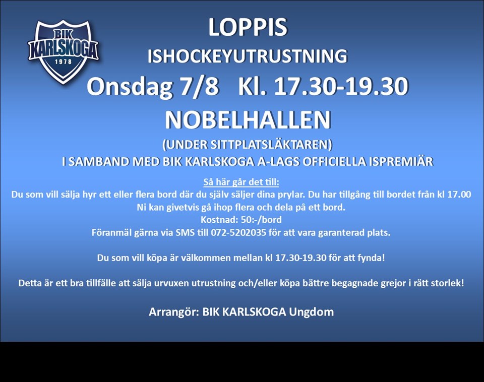 ”HOCKEY-LOPPIS” LOPPIS ISHOCKEYUTRUSTNING ONSDAG 7 AUGUSTI Kl. 17.30-19.30 NOBELHALLEN (UNDER SITTPLATSLÄKTAREN) I SAMBAND MED BIK KARLSKOGA A-LAGS OFFICIELLA ISPREMIÄR Så här går det till: Du som vill sälja hyr ett eller flera bord där du själv säljer dina prylar. Du har tillgång till bordet från kl 17.00. Ni kan givetvis gå ihop flera och dela på ett bord. Detta är ett bra tillfälle att sälja urvuxen utrustning och/eller köpa bättre begagnade grejor i rätt storlek! Kostnad: 50:-/bord Föranmäl gärna via SMS till 072-5202035 för att vara garanterad plats. Du som vill köpa är välkommen mellan kl 17.30-19.30 för att fynda! Arrangör: BIK KARLSKOGA Ungdom A-pojk 2 aug 2024 0kommentarer