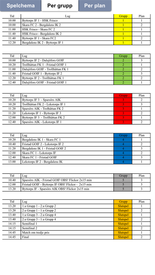 Hej Vi har nu fått programmet til lördagens cuper Båda lagen börjar vid 10 resp 10:20 vilket gör att vi alla samlas samtidigt, kl 08:30 vid Björkängsvallen. Alltså sovmorgon! :) Vi kommer eventuellt låna in ett par gubbar. /Ledarna
