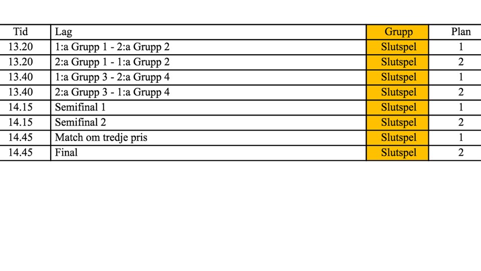 Hej Här är slutspelsschemat, om vi nu går dit. Fyra grupper, två lag går till kvartsfinal i varje grupp, sedan semi följt av final alt tredjeprismatch. Forza Bergdalen!