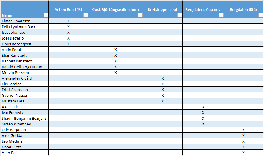 Föreningen behöver er föräldrars hjälp med några aktiviteter under året. Vi har på ett slumpmässigt sätt delat upp era uppgifter enligt ovan. Respektive föräldrar ansvarar för sitt åtagande, om man inte kan genomföra sitt åtagande får man försöka byta med någon annan. Efter att man har gjort upp med ny förälder meddelas mig, Calle Bergman. Hoppas på er förståelse för dessa insatser, och vem vet, det kanske till och med kan bli kul att hjälpa till, träffa lite folk och göra en god insats! :) OBSERVERA, det är dags för Action Run redan den 14:e maj och det är föräldrar till Elmar, Felix, Isac, Joel och Linus som deltar på denna.