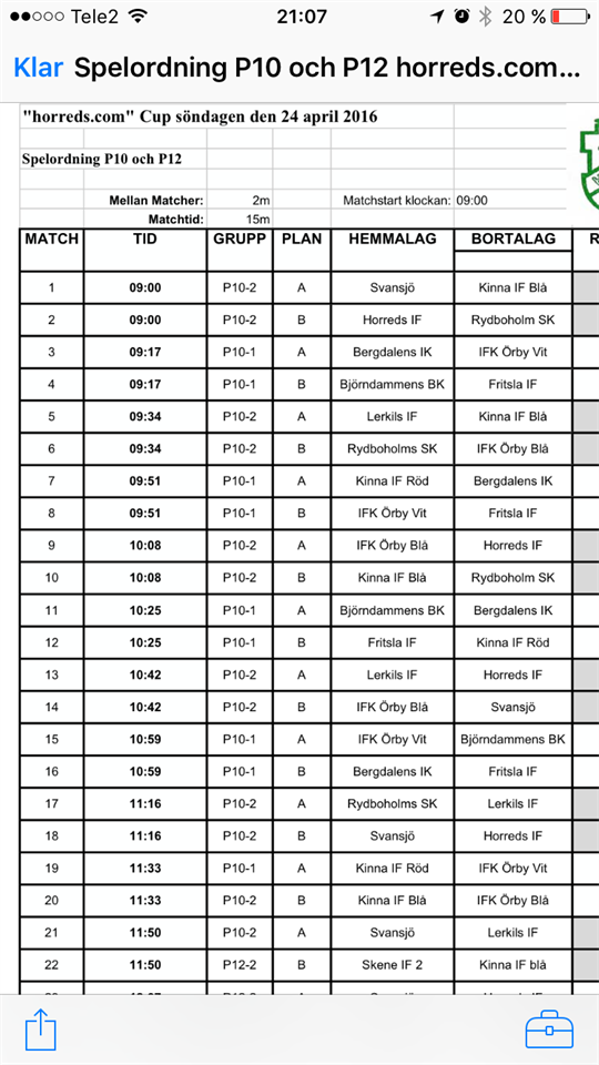 Hej Vi har nu kallat till Horreds cup. Vi har anmält ett lag och har tvingats dra strecket vid 50% träningsnärvaro. Gällande träningstider för våren och sommaren så är schemat försenat. Vi hoppas det spikas i dagarna och då kan vi lägga ut tiderna i kalendern. Det ser ut som att vi får 17:30-19:00 på måndag på konstgräs och samma tid på onsdagar på naturgräs. Det skulle innebära att vi kör from nu på måndag 18/4 på måndagar. Hur vi gör på onsdagar den kommande får vi se då naturgräset sannolikt är avstängt. Kanske kör vi fys eller letar upp en liten skolgårdsplan eller liknande. Vi återkommer. /Ledarna
