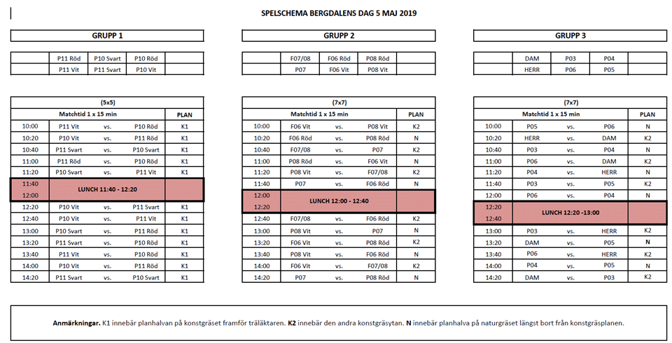 Hej Eftersom vi har en (viktig) match mot Sjömarken på söndag eftermiddag kommer vi bara spela fyra matcher (två per spelare) på Bergdalens Dag. Tidig (samling kl 09:30 ombytta, match kl 10:00 och 11:00) Axel F, Hannes, Elias, Olle, Axel G, Leontin, Joel och Felix Sena (samling kl 11:30 ombytta, match kl 12:00 och 13:40) Erik, Moffa, Gabriel, Sami, Albin, Viggo, Max, Andre B och Melvin Vi tar inte fram matchställ, vi vill helst att grabbarna har Bergdalenkläder annars går det bra med annat rött. Vi tror och hoppas att grabbarna vill vara på plats hela dagen då de har många klasskompisar som spelar och det finns lite tävlingar, grill, Ravelli mm.