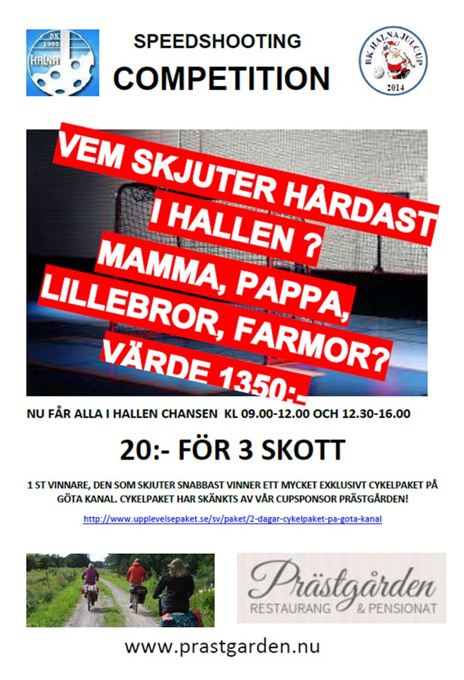 VEM SKJUTER HÅRDAST I HALLEN? Nu får alla besökare chansen också! Kanske är det Mamma, Pappa, Lillebror eller Farmor? 1 st vinnare, den som skjuter snabbast vinner ett mycket exklusivt cykelpaket utmed Göta Kanal. Cykelpaket har skänkts av vår klubbsponsor Prästgården. Värde 1350 SEK. 20 SEK för 3 skott! Se bild för mer info. Julcupen 5 dec 2014 0kommentarer