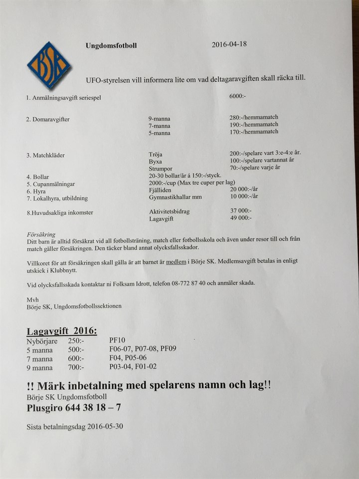 Hej! Lagavgift skall betalas till BSK. Inbetalningen 500 kr skall betalas senast 30/5. Se bifogad fil. Med vänlig hälsning, Stefan