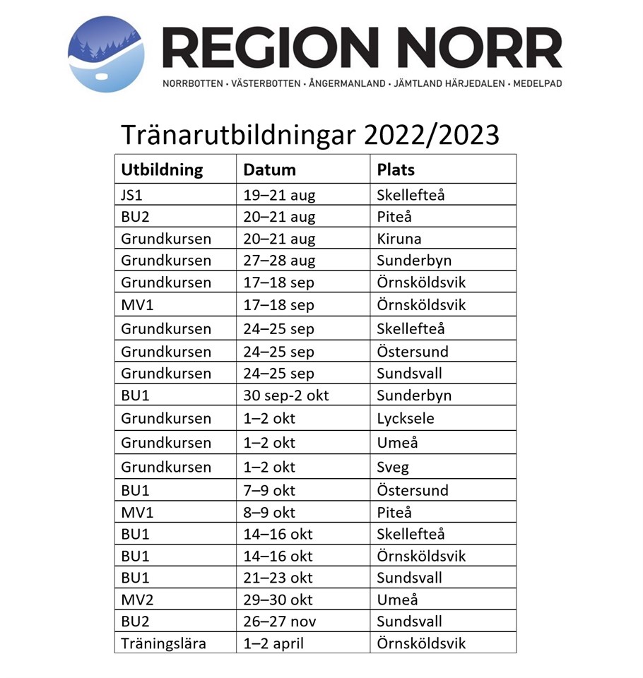 Nu finns Region Norrs tränarutbildningar för kommande säsong (2022/2023) officiella. Samtliga utbildningstillfällen finner ni i Utbildningsplattformen IUP, och även på Region Norrs hemsida. Anmälan till utbildningstillfället gör varje enskild ledare själv. Meddela vilka utbildningar ni tänkt gå eller anmält er till. Anita på anita@boltemo.se. Instruktioner för hur du skapar en personlig profil i IUP samt hur du anmäler dig till en utbildning finns i ett utskick från klubben. Antalet platser till respektive utbildningstillfälle är begränsat, så anmäl din förenings ledare i god tid. #kunskapärintetungtattbära IUP: https://utbildning.swehockey.se/ Nyhetsbrev: https://public.paloma.se/webversion?cid=25488&cmg=11e7e584-d0c3-47b1-9612-a8e26539a453&g=000bc8a4-0259-48e4-ba4a-76d7c3cd1d91 Region Norrs hemsida: https://www.swehockey.se/Regioner/RegionNorr/tranare/Utbildningar/
