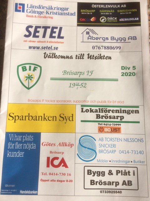 Årets fotbollssäsong kommer inte att vara som andra. Allt seriespel är inställt tills vidare. Men som vanligt kommer vårt programblad delas ut till ca 1500 hushåll i Brösarps samhälle och närliggande postnummer. Dessutom kommer ca 500 sommargäster få programbladet I vecka 25. Håll utkik i din brevlåda!