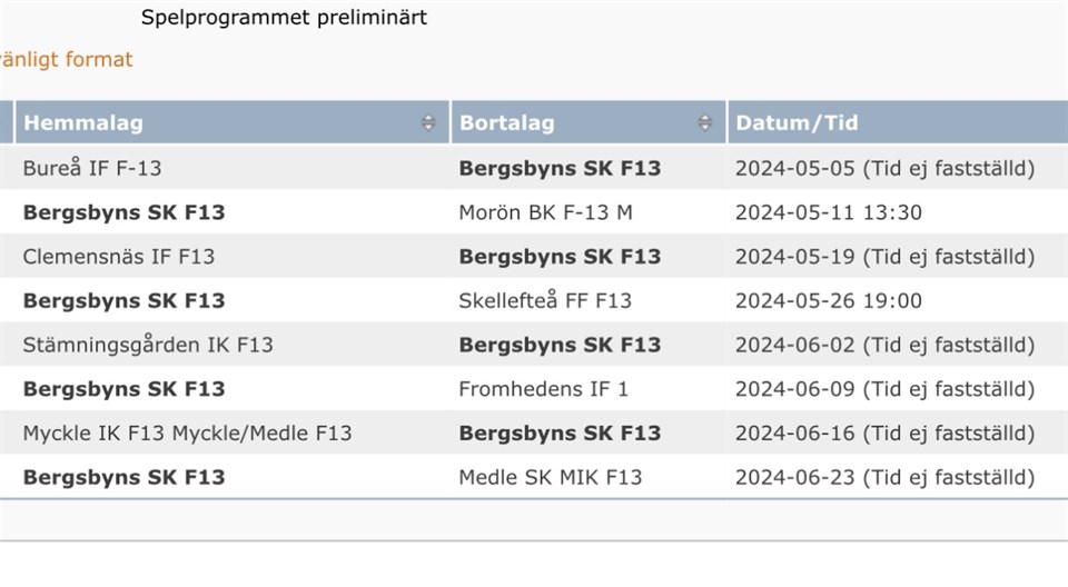 Hej! Spelprogrammet har nu släppts preliminärt, tiderna är ej satta och dagarna kan ibland flyttas. Men vill att ni ska få dessa tider så fort som möjligt. (Se bifogad fil) Jag kommer att lägga in matcherna i kalendern så fort dag & tid blivit bekräftade. Våra första hemmamatcher kommer att spelas på guldvallen & dessa tider är redan bokade. Vi har även tänkt att anmäla laget till Coop cupen den 9-10/5, myggvalla cupen den 15/6 och sedan Piteå summer games 28-30/6. Hälsningar Emma F-13 18 apr 2024 4kommentarer