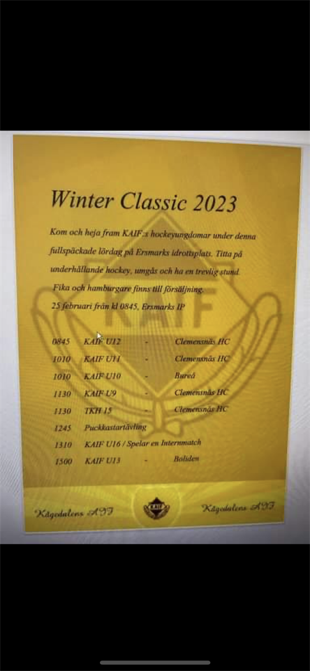 Hej! Nu har spelschemat för lördagen kommit,vi spelar matcher från kl 11.30. Vi ställer upp med två lag och möter KAIF! (Varje lag spelar två matcher) Vi samlas på Ersmarks IP 10.45 Fika och hamburgare finns till försäljning. Anmäl er på laget så vi vet om ni kommer! Vi ses! /Ledarna U11 20 feb 2023 1kommentar