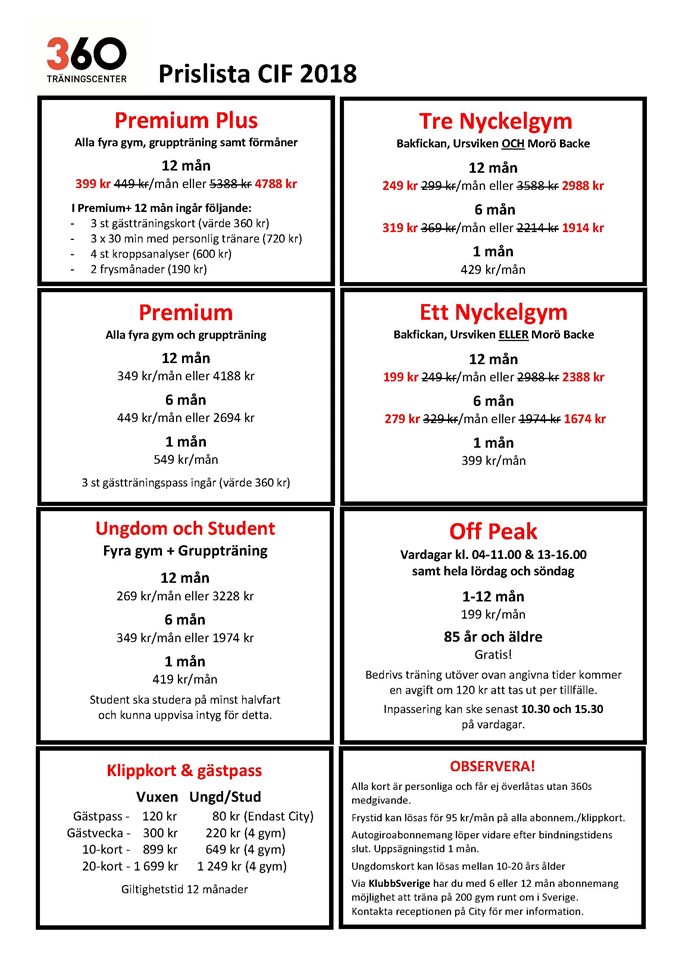 Alla CIF:s medlemmar har rabatt på 360. För er som har betalat medlemsavgift så är det bara att komma förbi kansliet och hämta ett medlemskort som du sedan visar upp på 360 för att få ta del av de rabatterade priserna. För er ledare så är det bara att hämta upp ett medlemskort. Gäller för 4 ledare/lag. Är du inte medlem? Då kan du bli Stödmedlem för att ta del av samma rabatt. Stödmedlemskapet till CIF kostar 150 kr och betalas in via Swishnummer 123 156 98 47. I meddelanderutan skriver du ”Stödmedlem CIF” och ditt personnummer. För att få ta del av rabatten visar du sen upp Swish-betalningen när du köper ditt träningskort på 360 Träningscenter . Clemensnäs IF 8 mar 2018 0kommentarer