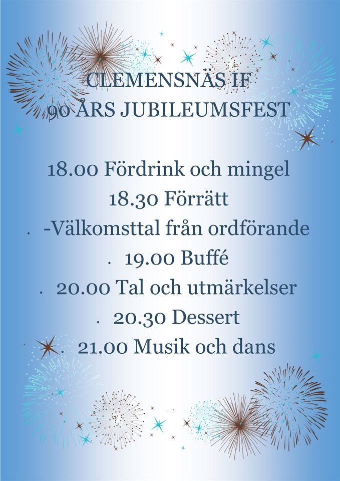 Nu börjar det närma sig. Nu på lördag den 17:e håller vi jubileumsfest för Clemensnäs IF som fyller 90 år. Jätteroligt att så många har anmält sig. Lite hållltider för kvällen: Kl 18.00 Fördrink och mingel Kl 18.30 Förrätt och välkomsttal från ordförande Jens Karlsson Kl 19.00 Buffé Kl 20.00 Tal och utmärkelser Kl 20.30 Dessert Kl 21.00 Musik och dans Detta är bara ungerfärliga hålltider för kvällen. Festen är på Folkets Hus, Klemensnäs. Varmt Välkomna önskar CIF.