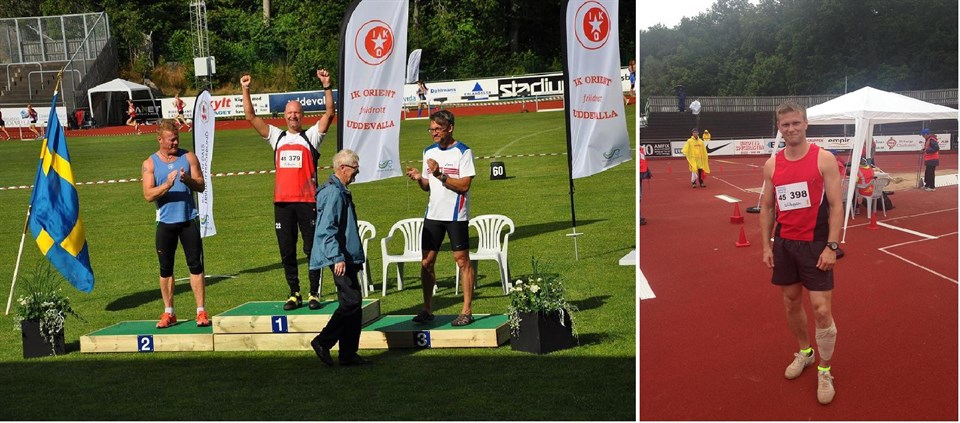 I helgen 24--26/7 avgjordes veteran-SM i friidrott på Rimnersvallen i Uddevalla. Johan Sundström och Fredrik de Paulis, medlemmar i Dals Södra FFI, svarade båda för mycket fina prestationer. Johan tog guld i M45 Spjut med ett kast på 54,70 och Fredrik tog brons i M45 Längd med ett hopp på 5,24. Fredrik blev dessutom trea i första försöksheatet i M45 100 m med tiden 13:08, endast 4/100 från finalplats, och han slutade därmed på en fin 7:e-plats i sammandraget. Stort GRATTIS till Johan och Fredrik! Senaste medaljen i ett veteran-SM för Dals Södra FFI var när Stig Johansson för 13 år sedan tog SM-brons i M65 Vikt inomhus i Malmö 2002 (11,96 med 9,08-kilos-vikten). Johans spjutresultat 54,70 innebär också nytt klubbrekord för M45, det gamla rekordet på 38,38 sattes av Karl-Erik Danielsson vid en tävling i Nyköping 21-23/8 1987. Distriktsrekordet för M45 Spjut i Bohuslän-Dal är på 57,26 och sattes av Bo Johansson, IK Orient, 2006. Inte långt upp till distriktsrekordet för Johan! Fredriks längdresultat 5,24 var också det nytt klubbrekord för M45. Även här hade Karl-Erik Danielsson det gamla rekordet på 5,22, satt vid en tävling på hemmaplan i Frändefors 19-20/8 1985. Distriktsrekordet i M45 Längd är på 5,56 och sattes 2005 av Benny Svensson, Tanums IF. Fredriks 100m-resultat 13:08 skulle också varit klubbrekord för M45 om det inte varit för stark vind (+2,3 mot tillåtna +2,0). Återigen är det Karl-Erik Danielsson som har klubbrekordet på 13:30. Distriktsrekordet i M45 100m på 12:64 sattes 1981 av Rune Larsson, IK Orient. Bilden visar Johan Sundström överst på prispallen och Fredrik de Paulis vid längdhoppsgropen på Rimnersvallen.