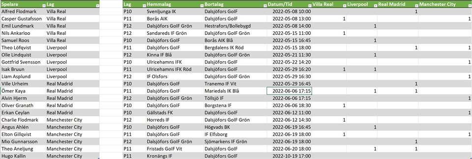 Vi har gjort klart indelningen av matcher för våren 2022. Vi har försökt fördela matcherna jämt mellan samtliga grupper. Till hösten försöker vi justera de lag som kanske inte spelat med varandra under våren. För P12 och P10 matcher gäller att vi ska skicka 3 spelare per match. Så vi kommer att kalla 3 spelare ur varje grupp till dessa matcher via laget.se i god tid. P-11 3 maj 2022 2kommentarer